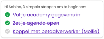 Als je de koppeling hebt gemaakt, maar er ontbreken nog gegevens of deze worden nog door Mollie gecontroleerd, dan zie je een lichtgroen icoon. Zijn alle drie de stappen succesvol doorlopen? Dan verdwijnt deze actiekaart. Controleer alleen nog even of je telefoonnummer is ingevuld in je leraarprofiel, zodat deze voor spelers zichtbaar is. Ga naar Profiel > Leraar profiel en vul je gegevens in.